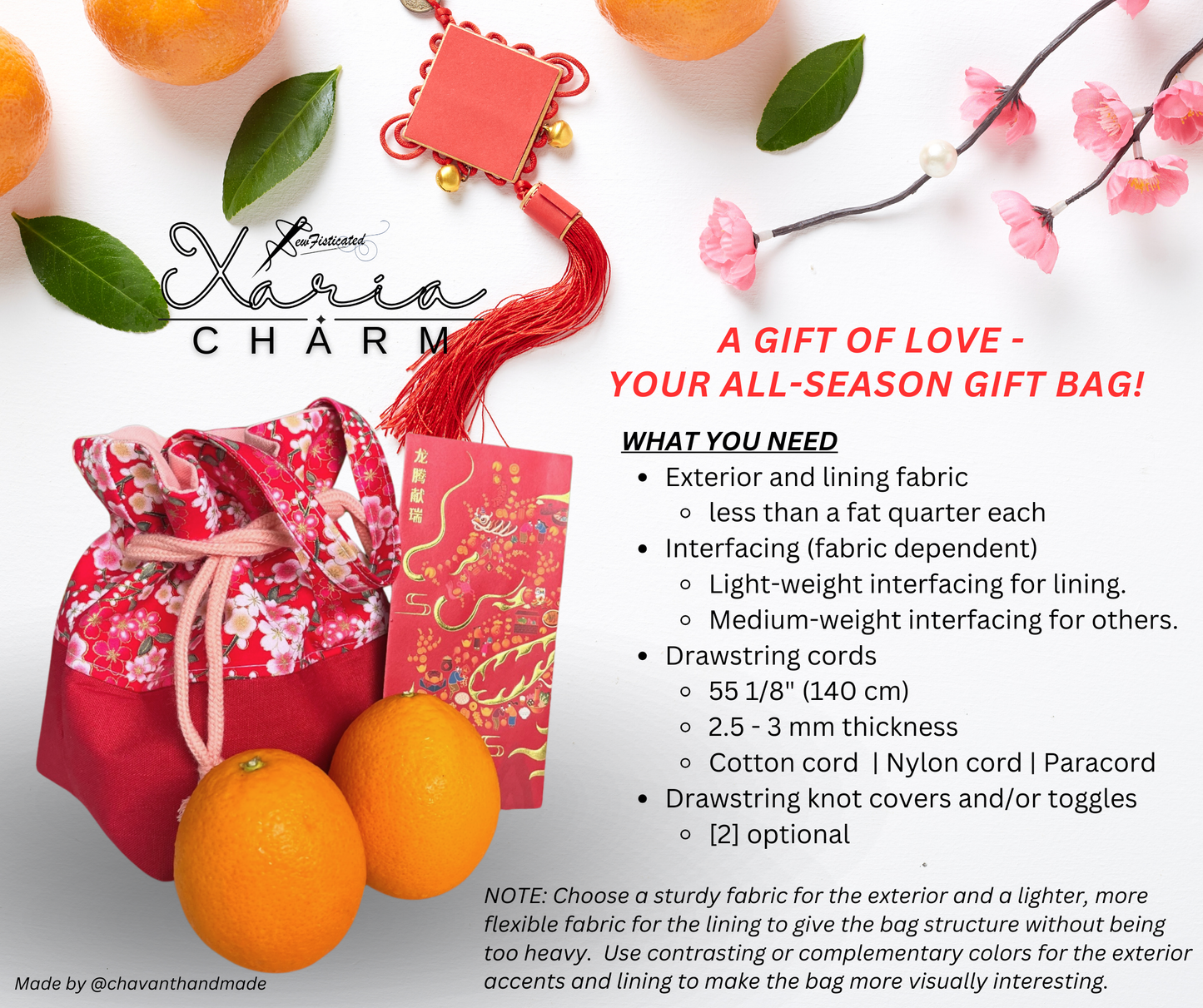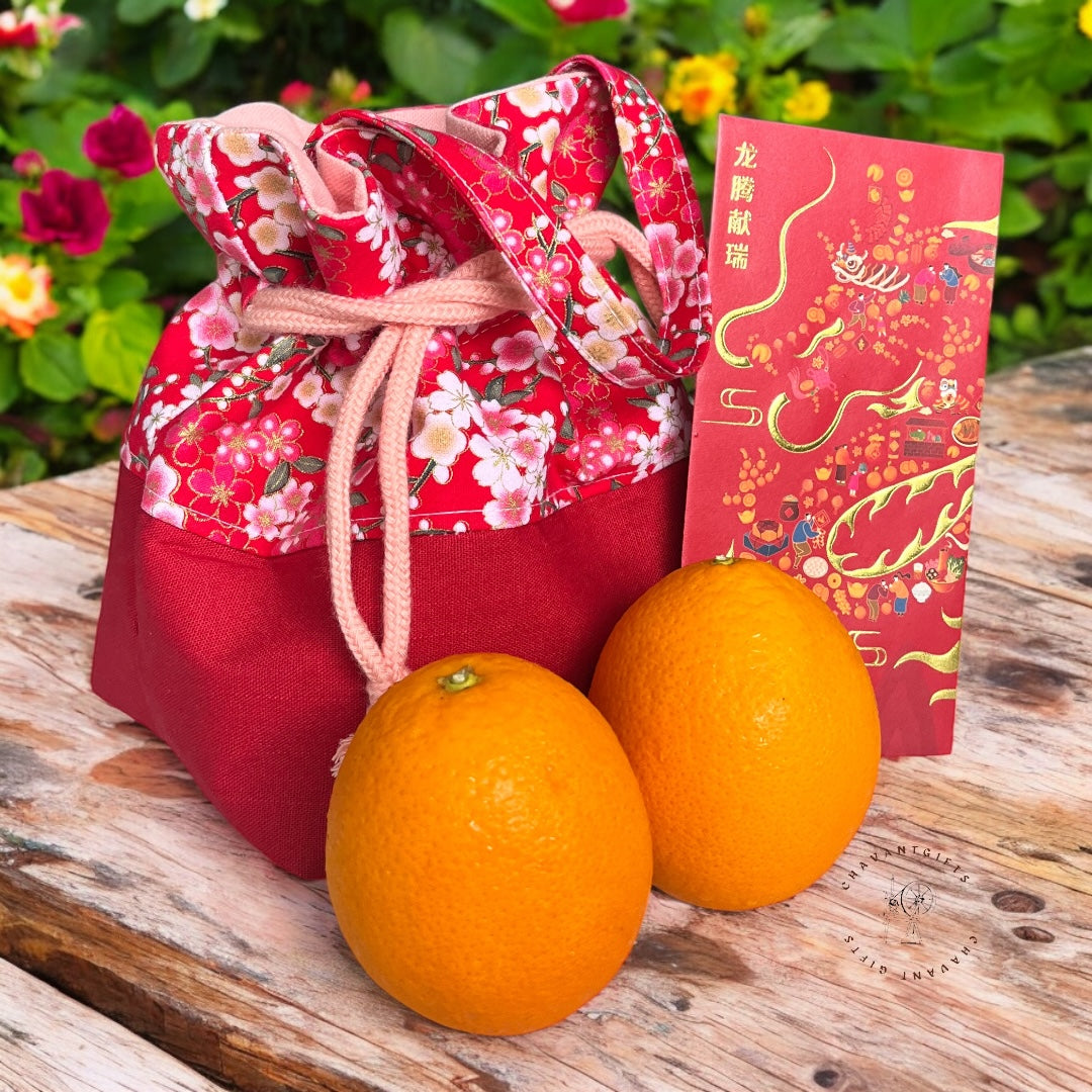 This drawstring bag pattern is inspired by the vibrant orange bags often used during Lunar New Year celebrations. Not only is it perfect for the festive occasion, it can also easily transform into a charming trick-or-treat bag for Halloween, a personalized gift bag for Christmas, a Valentine's Day bag, or an Easter egg bag for Easter. The possibilities are endless!