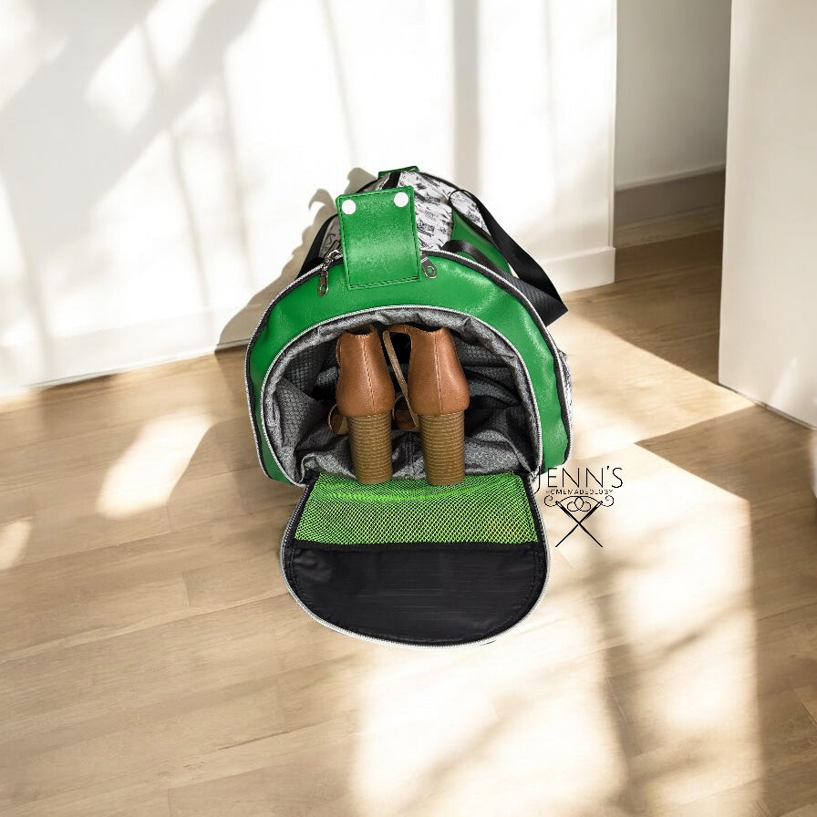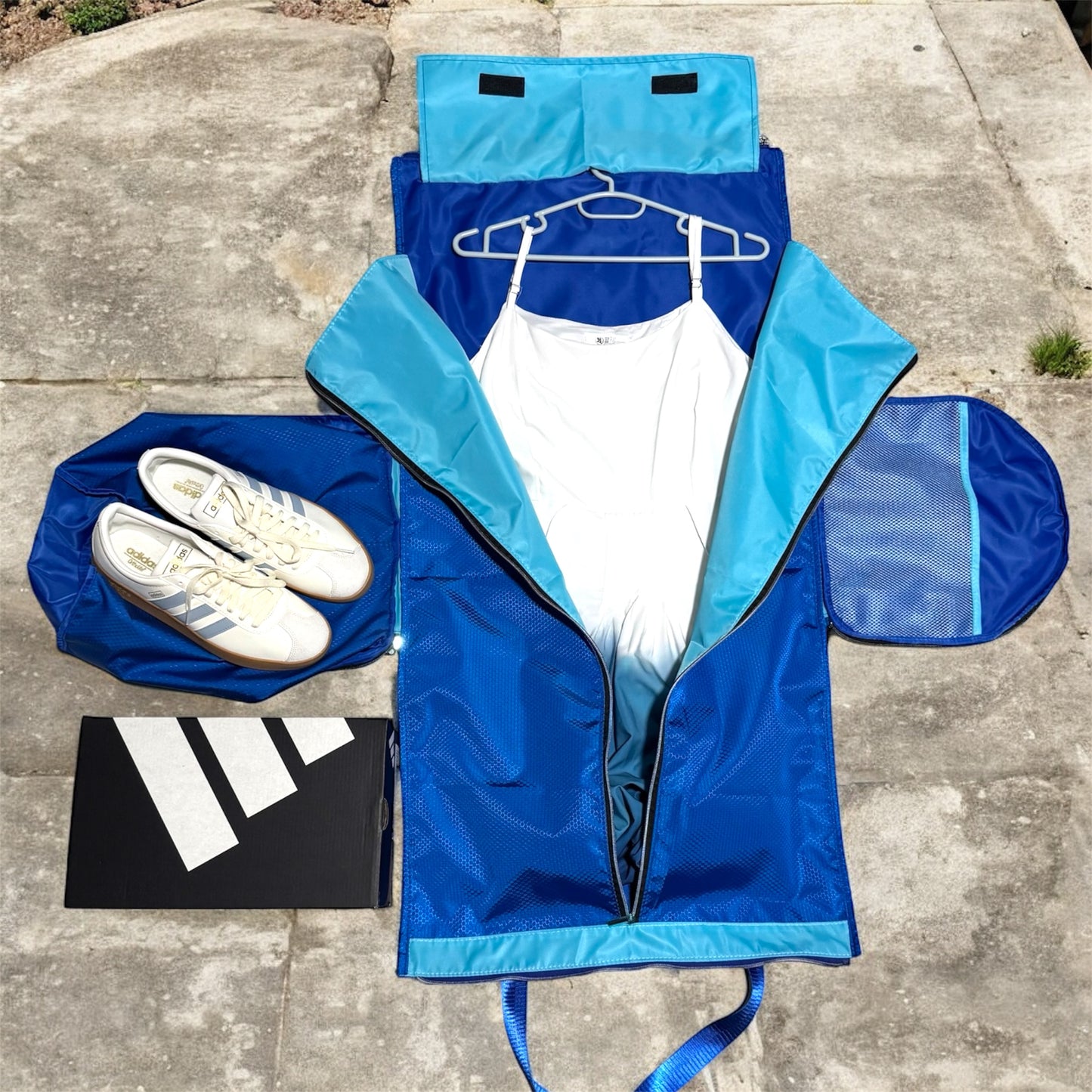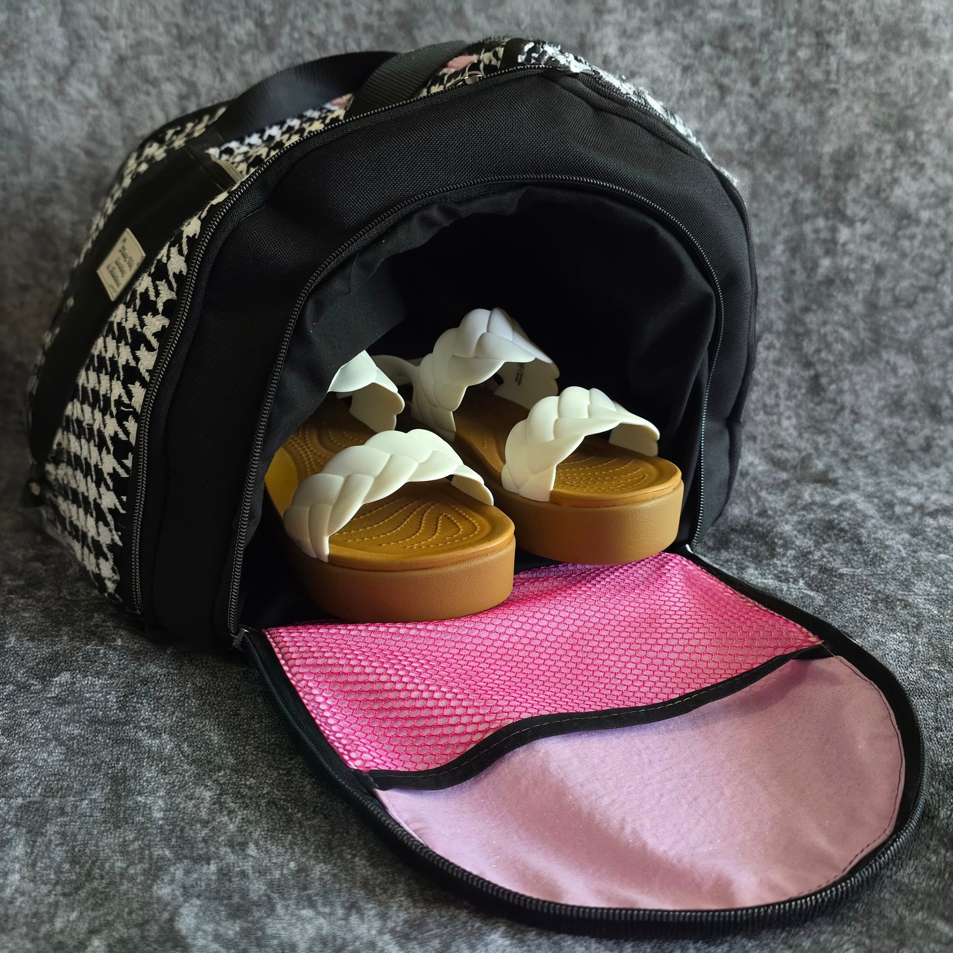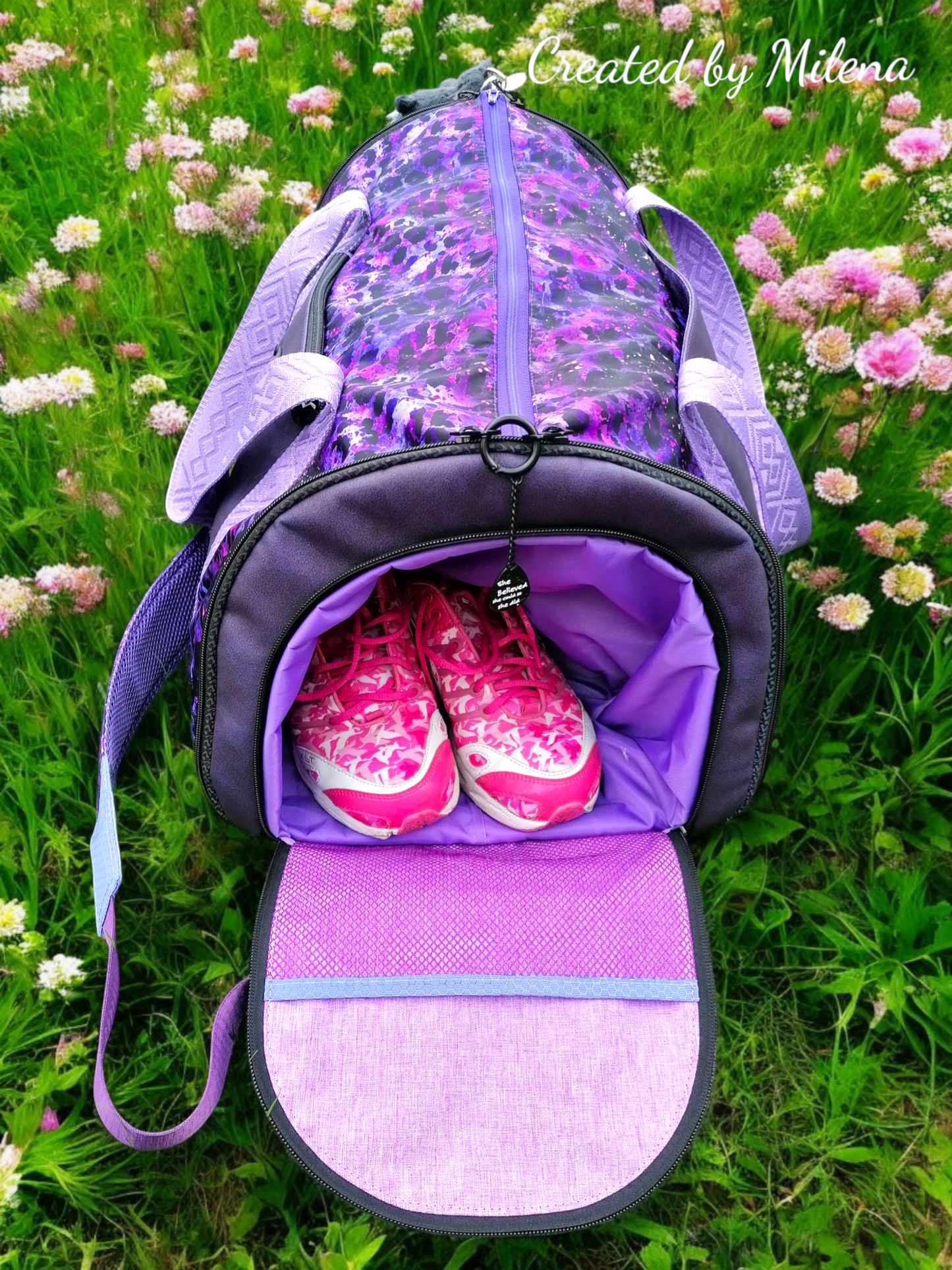 - Includes a shoe compartment and a side gusset zip-down compartment with a mesh pocket
