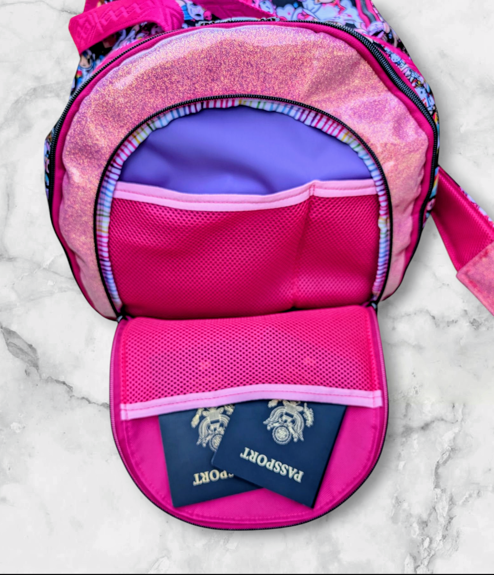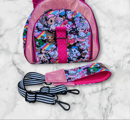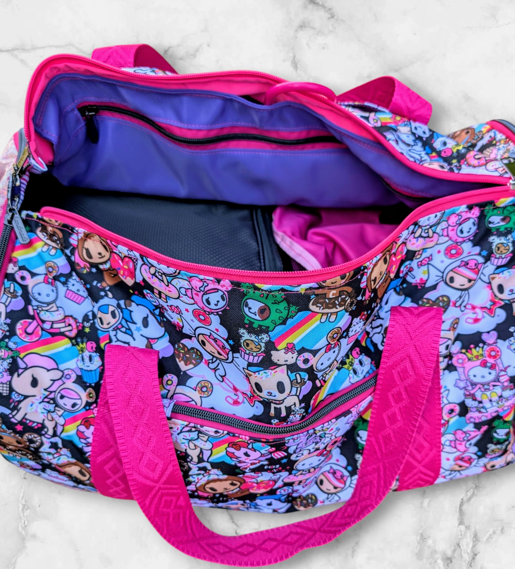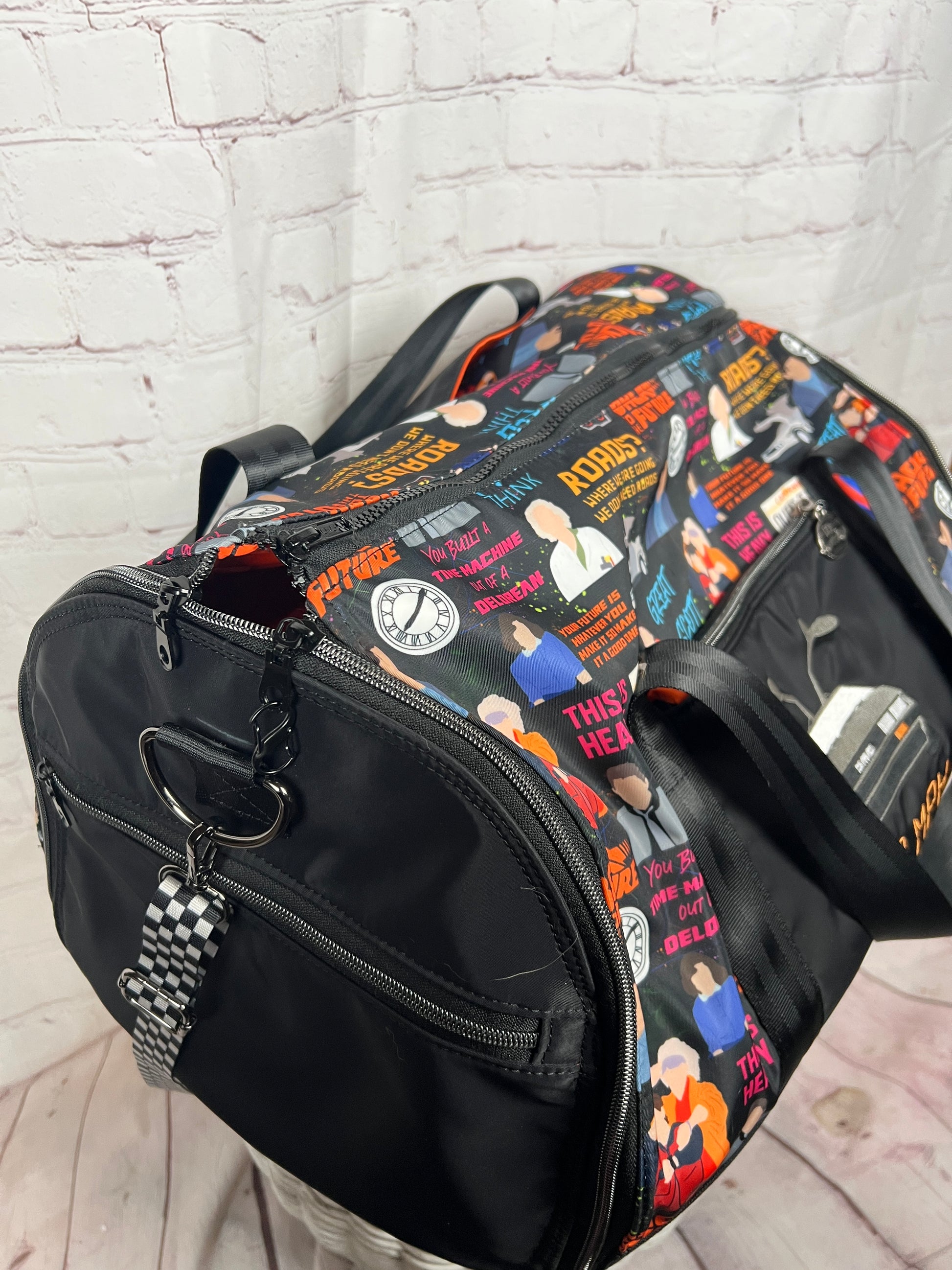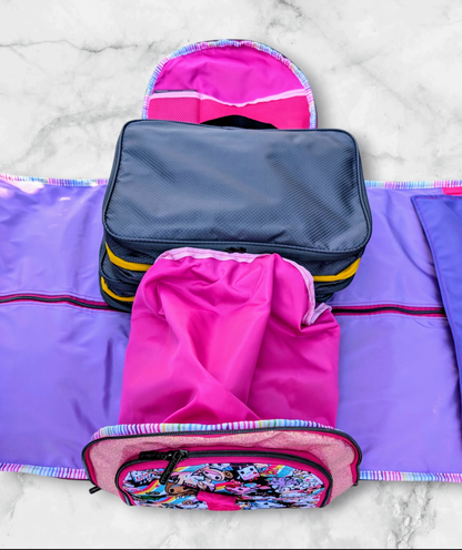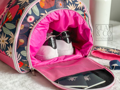 - Includes a shoe compartment and a side gusset zip-down compartment with a mesh pocket